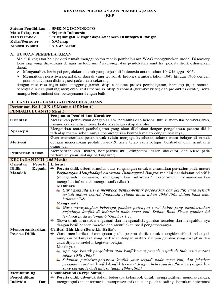 Rpp 1 lembar sejarah indonesia kelas x, xi dan xii sma revisi 2020 berdasarkan surat edaran nomor 14 tahun 2019 tentang penyederhanaan rencana pelaksanaan pembelajaran penyusunan rencana pelaksanaan pembelajaran (rpp) dilakukan dengan prinsip efisien, efektif, dan berorientasi pada murid adapun penyederhanaannya meliputi sistematika dan komponen yang terdiri dari tiga komponen inti rpp yaitu.